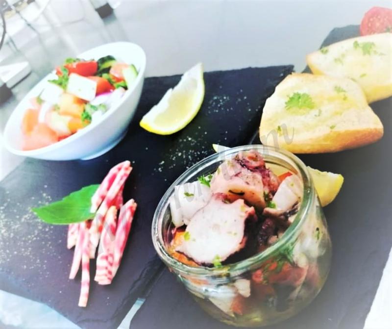 | poulpe grillé accompagné de pommes de terre grenailles au four | |