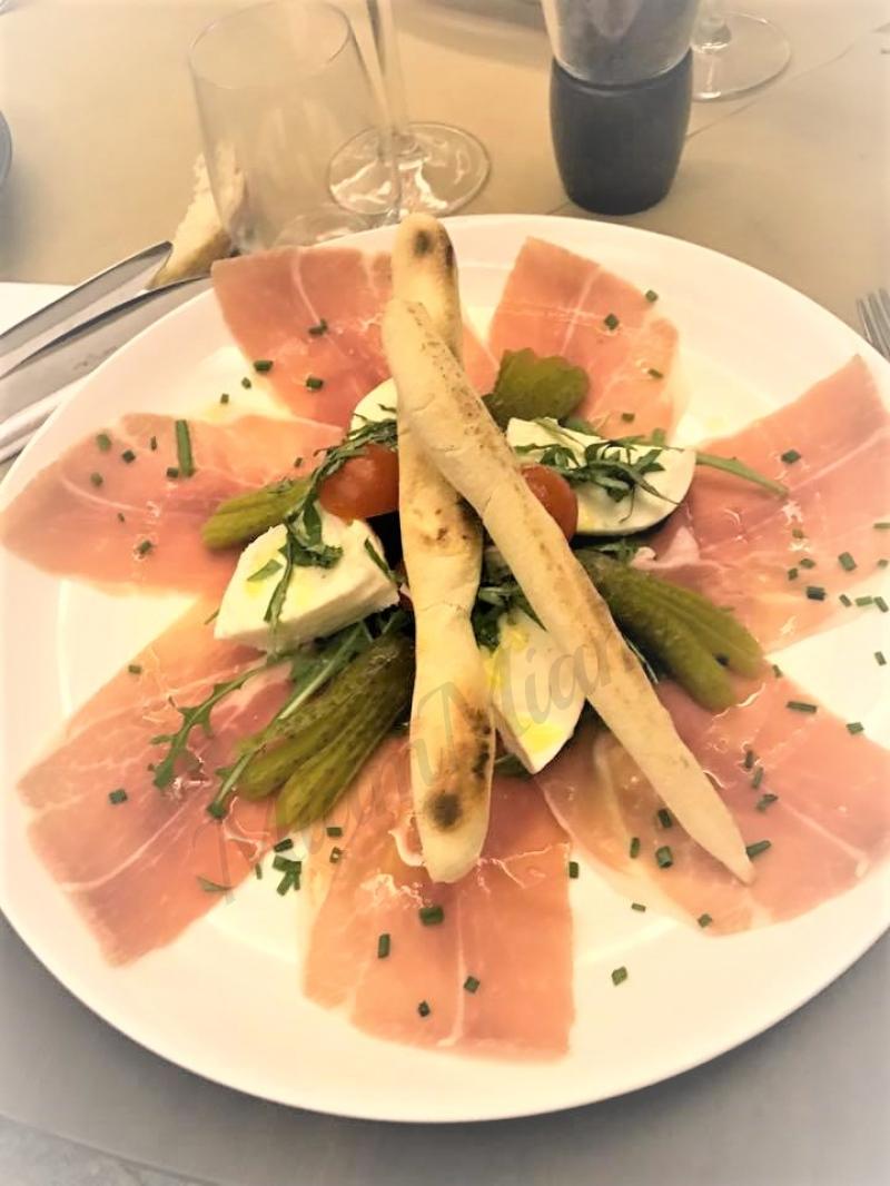 | jambon de parme, salami piquant, jambon cuit, salami, mozzarella di bufala et grissini | |
